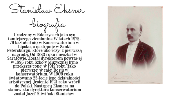Urodzony w Rdoszycach jako syn tamtejszego ziemianina W latach 1875-79 kształcił się w Konserwatorium w Lipsku, a następnie w Sankt Petersburgu, które ukończył z pierwszą nagrodą. Od 1883 roku mieszkał w Saratowie. Został dyrektorem powstałej w 1895 roku Szkoły Muzycznej Irmo przekształconej w 1912 roku (jako pierwszej w całej Rosji) w konserwatorium. W 1909 roku świętowano 25-lecie jego działalności artystycznej. Jesienią 1921 roku wrócił do Polski. Następcą Eksnera na stanowisku dyrektora konserwatorium został Józef Śliwiński Stanisław