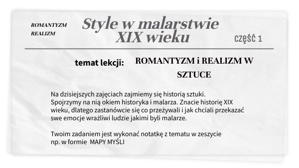 Na dzisiejszych zajęciach zajmiemy się historią sztuki. Spojrzymy na nią okiem historyka i malarza. Znacie historię XIX wieku, dlatego zastanówcie się co przeżywali i jak chciali przekazać swe emocje wrażliwi ludzie jakimi byli malarze. Twoim zadaniem jest wykonać notatkę z tematu w zeszycie np. w formie MAPY MYŚLI