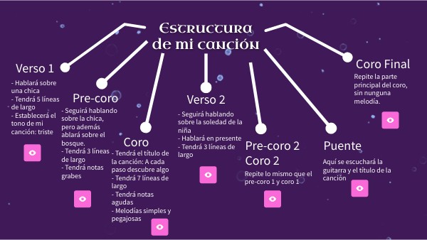 - Tendrá el título de la canción: A cada paso descubre algo- Tendrá 7 líneas de largo - Tendrá notas agudas - Melodías simples y pegajosas
