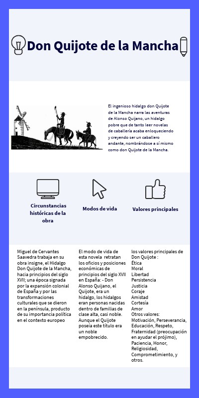 los valores principales de Don Quijote :Ética Moral Libertad Persistencia Justicia Coraje Amistad Cortesía Amor Otros valores: Motivación, Perseverancia, Educación, Respeto, Fraternidad (preocupación en ayudar el prójimo), Paciencia, Honor, Religiosidad, Comprometimiento, y otros.