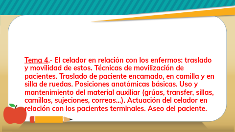 Tema 4.- El celador en relación con los enfermos: traslado y movilidad de estos. Técnicas de movilización de pacientes. Traslado de paciente encamado, en camilla y en silla de ruedas. Posiciones anatómicas básicas. Uso y mantenimiento del material auxiliar (grúas, transfer, sillas, camillas, sujeciones, correas…). Actuación del celador en relación con los pacientes terminales. Aseo del paciente.