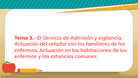 Tema 3.- El Servicio de Admisión y vigilancia. Actuación del celador con los familiares de los enfermos. Actuación en las habitaciones de los enfermos y las estancias comunes.