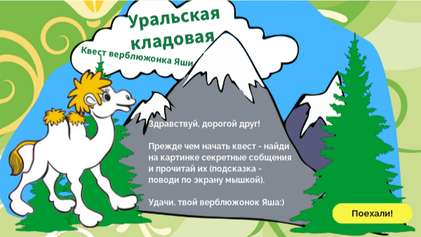 Здравствуй, дорогой друг!Прежде чем начать квест - найди на картинке секретные собщения и прочитай их (подсказка - поводи по экрану мышкой). Удачи, твой верблюжонок Яша:)