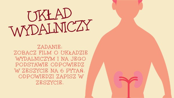 Zadanie: Zobacz film o układzie wydalniczym i na jego podstawie odpowiedz w zeszycie na 6 pytań. Odpowiedzi zapisz w zeszycie.