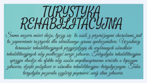 Sama nazwa mówi dużo, tyczy się to osób z przeróżnymi chorobami, jest to zapewnienie rozrywki dla określonego grona społeczeństwa. Uczestnicy turnusów rehabilitacyjnych przyjeżdżają do wybranych ośrodków rehabilitacyjnych aby podleczyć swoje zdrowie. Turystyka rehabilitacyjna sprzyja drodze do efektu aby osoba niepełnosprawna wróciła o lepszym zdrowiu, dzięki pobytowi w ośrodku rehabilitacyjno-turystycznym. Taka turystyka pozwala szybciej poprawić swój stan zdrowia