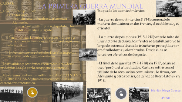 Etapas de los acontecimientos: - La guerra de movimientos (1914): comenzó de manera simultánea en dos frentes, el occidental y el oriental. - La guerra de posiciones (1915-1916): ante la falta de una victoria decisiva, los frentes se estabilizaron a lo largo de extensas líneas de trincheras protegidas por ametralladoras y alambradas. Desde ellas se lanzaron ofensivas de desgaste. - El final de la guerra (1917-1918): en 1917, ee.uu se incorporójunt a los aliados. Rusia se retiró tras el triunfo de la revolución comunista y la firma, con Alemania y otros paises, de la Paz de Brest-Litovsk en 1918.