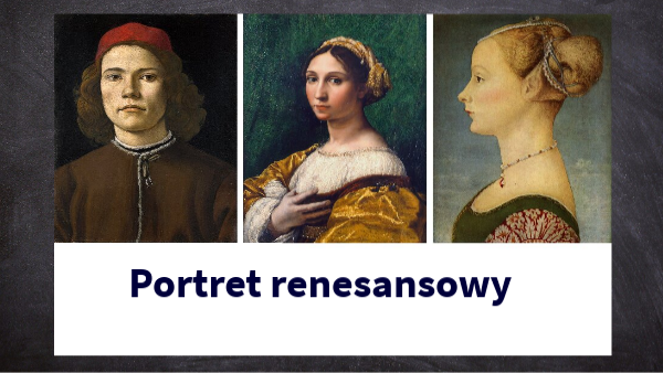 Renesans to epoka wielkiego rozwoju malarstwa portretowego – postaci o doskonałych proporcjach, idealizowane lub przedstawiane realistycznie; najpopularniejszy typ portretu to ujęcia popiersiowe i półpostaciowe en face lub z profilu na tle krajobrazu lub okna otwierającego się na pejzaż. Typy portretu ze względu na ujęcie postaci: wizerunek głowy – sama głowa modela, typ stosowany często przy ujęciach z profilu, np. na medalionach popiersie – ukazana jest głowa modela z szyją i ramionami (szczególnie popularne w rzeźbie) półpostać – jak sama nazwa wskazuje, postać jest ukazana w połowie, od pasa w górę portret do kolan – czasami zwany ujęciem w ¾; rzadziej spotykana forma portretu, która jednak pozwala na ukazanie postaci niemal w całości, ale z zachowaniem pewnej bliskości na poziomie „kadrowania” en pied (portret całopostaciowy) – popularny zwłaszcza w przedstawieniach oficjalnych władców czy postaci historycznych, choć nie tylko. Kolejnym ważnym elementem przedstawienia jest upozowanie głowy portretowanego. Wyróżniamy następujące rodzaje: en face (frontalnie) – głowa jest ukazana z przodu, centralnie profil – głowa ukazana z jednego boku półprofil – ujęcie miedzy en face a profilem, głowa lekko poruszona, ale nie całkiem skręcona w bok en trois quarts (w trzech czwartych) – ujęcie, w którym postać zwraca się mocno w stronę widza, ale najczęściej jej ramiona są ukazane z boku, wygląda więc trochę jakby zerkała na nas przez ramię lub odwracała się w naszą stronę profil perdu (ćwierćprofil) – w tym ujęciu postać odwraca głowę od widza tak, że ten może dostrzec tylko zarys jej policzka lub nosa; dosłownie z francuskiego oznacza to „profil zgubiony”, tak jakby twarz postaci umykała nam z pola widzenia.