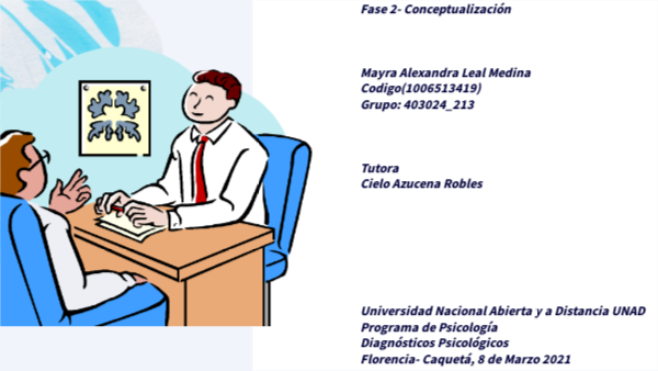 Fase 2- Conceptualización Mayra Alexandra Leal Medina Codigo(1006513419) Grupo: 403024_213 Tutora Cielo Azucena Robles Universidad Nacional Abierta y a Distancia UNAD Programa de Psicología Diagnósticos Psicológicos Florencia- Caquetá, 8 de Marzo 2021