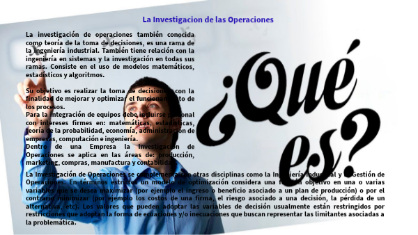 La investigación de operaciones también conocida como teoría de la toma de decisiones, es una rama de la ingeniería industrial. También tiene relación con la ingeniería en sistemas y la investigación en todas sus ramas. Consiste en el uso de modelos matemáticos, estadísticos y algoritmos. Su objetivo es realizar la toma de decisiones, con la finalidad de mejorar y optimizar el funcionamiento de los procesos. Para la integración de equipos debe incluirse personal con intereses firmes en: matemáticas, estadísticas, teoría de la probabilidad, economía, administración de empresas, computación e ingeniería. Dentro de una Empresa la Investigación de Operaciones se aplica en las áreas de: producción, marketing, compras, manufactura y contabilidad.