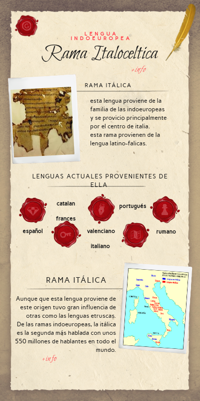 Aunque que esta lengua proviene de este origen tuvo gran influencia de otras como las lenguas etruscas. De las ramas indoeuropeas, la itálica es la segunda más hablada con unos 550 millones de hablantes en todo el mundo.