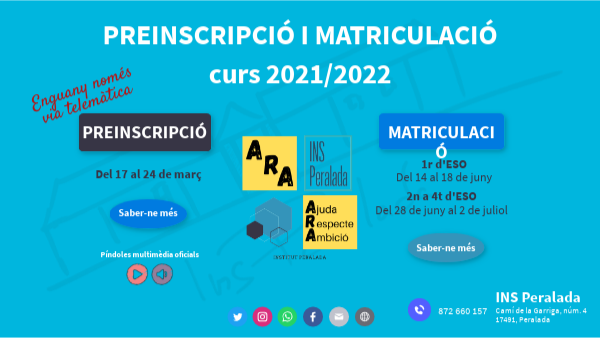 Preinscripció matrícula pel curs 2021/2022 a l'Institut Peralada