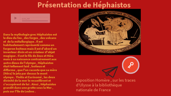Dans la mythologie grec Héphaistos est le dieu du feu , des forges , des volcans et de la métallurgique . Il est habituelement représenté comme un forgeron boiteux mais il est d'abord un inventeur divin et un créateur d'objet magique . Il est le fils de Zeus et Héra mais à sa naissance contrairement aux autre dieux de l'olympe , Héphaistos était tellement laid , boiteux et difforme , que l'on raconte que sa mère (Héra) le jeta par dessus le mont olympe . Thétis et Eurinomé , les deux divinité de la mer le recueillirent et s'occupèrent de lui . Ainsi , Héphaistos grandit dans une grotte sous la Mer , puis sur l'île de Lesbos .
