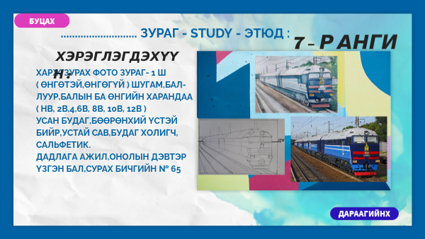 ЗУРАХ ГЭЖ БУЙ ЗҮЙЛЭЭ УРЬДЧИЛАН СУДАЛСАН БАЙХ.СУДАЛЖ ЗУРАХААР БЭЛТГЭСЭН ЗУРАГТАА ТОХИРСОН,БАГАЖ,ХЭРЭГЛЭГДЭХҮҮН СОНГОСОН БАЙХ. ДАДЛАГА АЖЛЫН ДЭВТЭРТЭЭ ДҮРСЛЭХ, ЗОХИОМЖИЙН ШИЙДЛЭЭ, ТӨЛӨВЛӨН БОДСОН БАЙХ. ӨӨРТӨӨ ТОХИРСОН ЧӨЛӨӨТЭЙ ДҮРСЛЭХ АРГЫГ ТУРШСАН БАЙХ. АЖЛЫН БАЙРНЫ ТАВ ДУХТАЙ БАЙДАЛ,ЭМХ ЦЭГЦ,ГЭРЭЛТҮҮЛЭГ, АГААРЖУУЛАЛТАНД АНХААРАХ. ДАДЛАГА АЖЛЫГ ГҮЙЦЭТГЭХ ЯВЦАД ТОХИОЛДОХ,СААД БЭРХШЭЭЛИЙГ ДАВАН ТУУЛАХ,ТЭСВЭР,ТЭВЧЭЭРТЭЙ БАЙХ.
