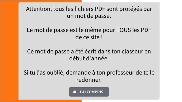 Attention, tous les fichiers PDF sont protégés par un mot de passe. Le mot de passe est le même pour TOUS les PDF de ce site ! Ce mot de passe a été écrit dans ton classeur en début d'année. Si tu l'as oublié, demande à ton professeur de te le redonner.