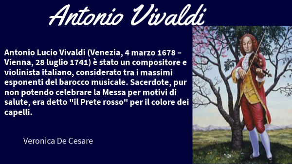 Antonio Lucio Vivaldi (Venezia, 4 marzo 1678 – Vienna, 28 luglio 1741) è stato un compositore e violinista italiano, considerato tra i massimi esponenti del barocco musicale. Sacerdote, pur non potendo celebrare la Messa per motivi di salute, era detto "il Prete rosso" per il colore dei capelli.