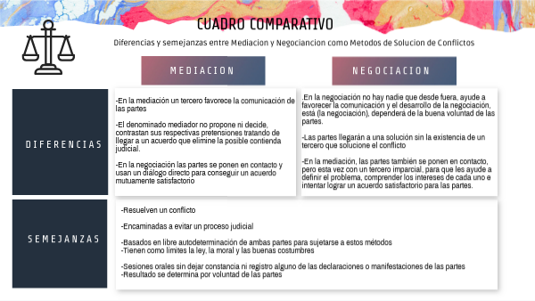 -En la mediación un tercero favorece la comunicación de las partes -El denominado mediador no propone ni decide, contrastan sus respectivas pretensiones tratando de llegar a un acuerdo que elimine la posible contienda judicial. -En la negociación las partes se ponen en contacto y usan un diálogo directo para conseguir un acuerdo mutuamente satisfactorio