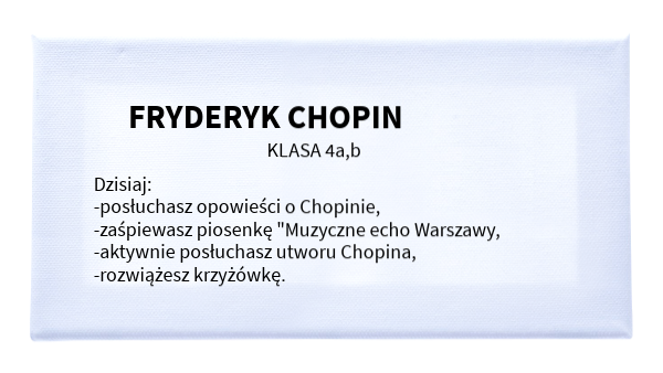 Dzisiaj: -posłuchasz opowieści o Chopinie, -zaśpiewasz piosenkę "Muzyczne echo Warszawy, -aktywnie posłuchasz utworu Chopina, -rozwiążesz krzyżówkę.