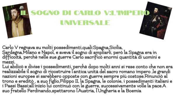 Carlo V regnava su molti possedimenti,quali:Spagna,Sicilia,Sardegna,Milano e Napol, e aveva il sogno di ampliarli, però la Spagna era in difficoltà, perchè nelle sue guerre Carlo sacrificò enormi quantità di uomini e mezzi. Lui abdicò e divise i possedimenti, perchè dopo molti anni si rese conto che non era realizzabile il sogno di ricostruire l'antica unità del sacro romano impero ,le grandi nazioni europee si sarebbero opposte con guerre sempre più costose.Rinunciò al trono e ereditò , a suo figlio,Filippo II, la Spagna, le colonie, i possedimenti italiani e i Paesi Bassi;all'inizio lui continuò con le guerre, successivamente volle la pace.A suo fratello Ferdinando,spettarono l'Austria, l'Ungheria e la Boemia