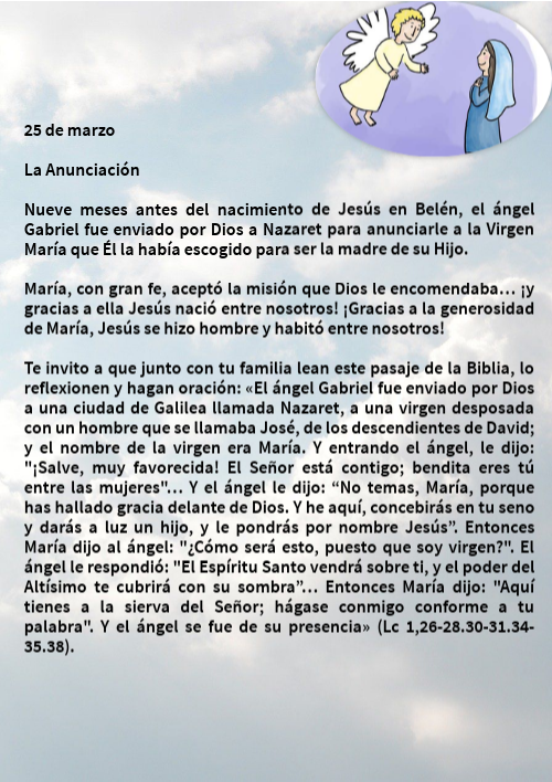 25 de marzo La Anunciación Nueve meses antes del nacimiento de Jesús en Belén, el ángel Gabriel fue enviado por Dios a Nazaret para anunciarle a la Virgen María que Él la había escogido para ser la madre de su Hijo. María, con gran fe, aceptó la misión que Dios le encomendaba… ¡y gracias a ella Jesús nació entre nosotros! ¡Gracias a la generosidad de María, Jesús se hizo hombre y habitó entre nosotros! Te invito a que junto con tu familia lean este pasaje de la Biblia, lo reflexionen y hagan oración: «El ángel Gabriel fue enviado por Dios a una ciudad de Galilea llamada Nazaret, a una virgen desposada con un hombre que se llamaba José, de los descendientes de David; y el nombre de la virgen era María. Y entrando el ángel, le dijo: "¡Salve, muy favorecida! El Señor está contigo; bendita eres tú entre las mujeres"… Y el ángel le dijo: “No temas, María, porque has hallado gracia delante de Dios. Y he aquí, concebirás en tu seno y darás a luz un hijo, y le pondrás por nombre Jesús”. Entonces María dijo al ángel: "¿Cómo será esto, puesto que soy virgen?". El ángel le respondió: "El Espíritu Santo vendrá sobre ti, y el poder del Altísimo te cubrirá con su sombra”… Entonces María dijo: "Aquí tienes a la sierva del Señor; hágase conmigo conforme a tu palabra". Y el ángel se fue de su presencia» (Lc 1,26-28.30-31.34-35.38).