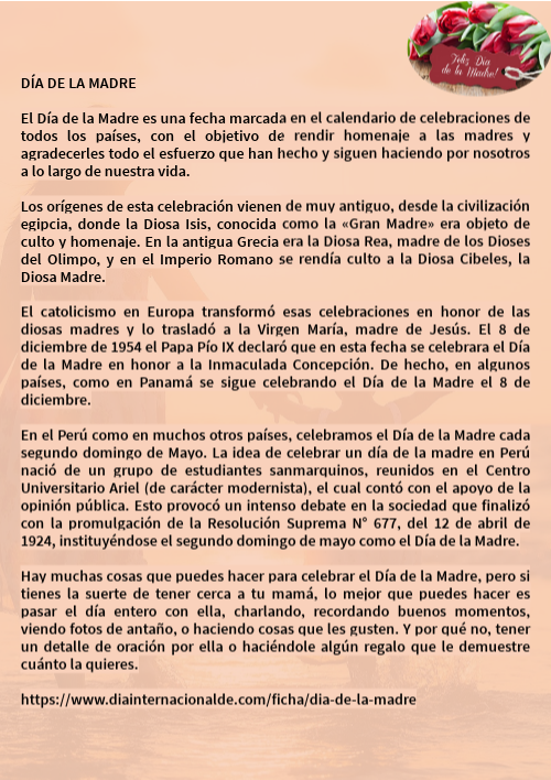 DÍA DE LA MADRE El Día de la Madre es una fecha marcada en el calendario de celebraciones de todos los países, con el objetivo de rendir homenaje a las madres y agradecerles todo el esfuerzo que han hecho y siguen haciendo por nosotros a lo largo de nuestra vida. Los orígenes de esta celebración vienen de muy antiguo, desde la civilización egipcia, donde la Diosa Isis, conocida como la «Gran Madre» era objeto de culto y homenaje. En la antigua Grecia era la Diosa Rea, madre de los Dioses del Olimpo, y en el Imperio Romano se rendía culto a la Diosa Cibeles, la Diosa Madre. El catolicismo en Europa transformó esas celebraciones en honor de las diosas madres y lo trasladó a la Virgen María, madre de Jesús. El 8 de diciembre de 1954 el Papa Pío IX declaró que en esta fecha se celebrara el Día de la Madre en honor a la Inmaculada Concepción. De hecho, en algunos países, como en Panamá se sigue celebrando el Día de la Madre el 8 de diciembre. En el Perú como en muchos otros países, celebramos el Día de la Madre cada segundo domingo de Mayo. La idea de celebrar un día de la madre en Perú nació de un grupo de estudiantes sanmarquinos, reunidos en el Centro Universitario Ariel (de carácter modernista), el cual contó con el apoyo de la opinión pública. Esto provocó un intenso debate en la sociedad que finalizó con la promulgación de la Resolución Suprema N° 677, del 12 de abril de 1924, instituyéndose el segundo domingo de mayo como el Día de la Madre. Hay muchas cosas que puedes hacer para celebrar el Día de la Madre, pero si tienes la suerte de tener cerca a tu mamá, lo mejor que puedes hacer es pasar el día entero con ella, charlando, recordando buenos momentos, viendo fotos de antaño, o haciendo cosas que les gusten. Y por qué no, tener un detalle de oración por ella o haciéndole algún regalo que le demuestre cuánto la quieres. https://www.diainternacionalde.com/ficha/dia-de-la-madre