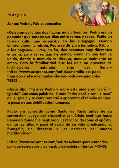 29 de junio Santos Pedro y Pablo, apóstoles «Celebramos juntos dos figuras muy diferentes: Pedro era un pescador que pasaba sus días entre remos y redes, Pablo un fariseo culto que enseñaba en las sinagogas. Cuando emprendieron la misión, Pedro se dirigió a los judíos, Pablo a los paganos… Eran, en fin, dos personas muy diferentes entre sí, pero se sentían hermanos, como en una familia unida, donde a menudo se discute, aunque realmente se aman. Pero la familiaridad que los unía no provenía de inclinaciones naturales, sino del Señor» (https://www.aciprensa.com/noticias/homilia-del-papa-francisco-en-la-solemnidad-de-san-pedro-y-san-pablo-78209). «Jesús dijo: “Tú eres Pedro y sobre esta piedra edificaré mi Iglesia”. Con estas palabras, Simón Pedro pasó a ser “la roca” de la Iglesia y se comprometió a apacentar el rebaño de Dios a pesar de sus debilidades humanas. Pablo era conocido como Saulo de Tarso antes de su conversión. Luego del encuentro con Cristo continuó hacia Damasco donde fue bautizado. Es reconocido como el apóstol de los gentiles y pasó el resto de su vida predicando el Evangelio sin descanso a las naciones del mundo mediterráneo» (https://www.aciprensa.com/noticias/claves-para-entender-por-que-san-pedro-y-san-pablo-se-celebran-juntos-44543).
