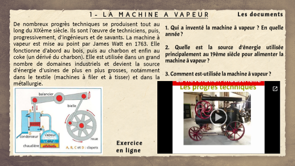 1. Qui a inventé la machine à vapeur ? En quelle année ?2. Quelle est la source d’énergie utilisée principalement au 19ème siècle pour alimenter la machine à vapeur ? 3. Comment est-utilisée la machine à vapeur ?