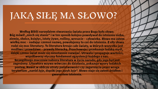 Według Biblii narzędziem stwarzania świata przez Boga było słowo. Bóg mówił „niech się stanie” i w ten sposób kolejno powoływał do istnienia niebo, ziemię, słońce, księżyc, istoty żywe, rośliny, wreszcie – człowieka. Słowo ma zatem wielką moc – nadając czemuś nazwę, powołujemy to coś do istnienia. Z siły słowa rodzi się moc literatury. To literatura kreuje całe światy, w których wszystko jest możliwe i prawdziwe – prawdę literacką. Przechowuje i przekazuje ludzką myśl, dzięki czemu świat może się nieustannie rozwijać. Utrwala i propaguje wartości, współtworzy etyczny fundament egzystencji każdego z nas. Szczególnego znaczenia nabiera literatura w życiu narodu, gdy jego byt jest zagrożony. Literatura wzywa wówczas do działania, pokazuje wzory ludzkich postaw. Nawet w obliczu utraty państwowości czy zagarnięcia przez wroga terytorium „naród żyje, dopóki jego język żyje”. Słowo staje się zatem źródłem i gwarantem istnienia.