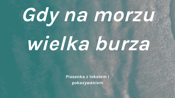 Gdy na morzu (fala ręką) wielka burza, (dwie dłonie rąbią burzę) Jezus (ręka w górę) ze mną (dłońmi wskazujemy siebie) w łodzi jest. (wiosłujemy uginając kolana) [2x] On za rękę trzyma mnie, (łapiemy swoją dłoń) łódka nie kołysze się. (kołyszemy się na boki) Jeszcze raz!