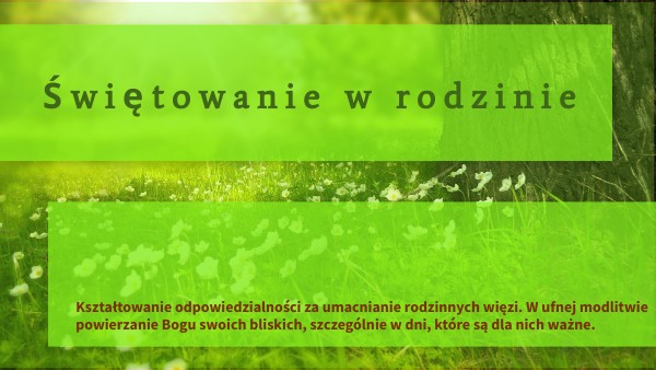 1. Świętowanie z Bogiem zapewnia Jego błogosławieństwo.2. Warto umacniać więzy rodzinne poprzez wspólne modlitwy, spacery , rozmowy, posiłki.
