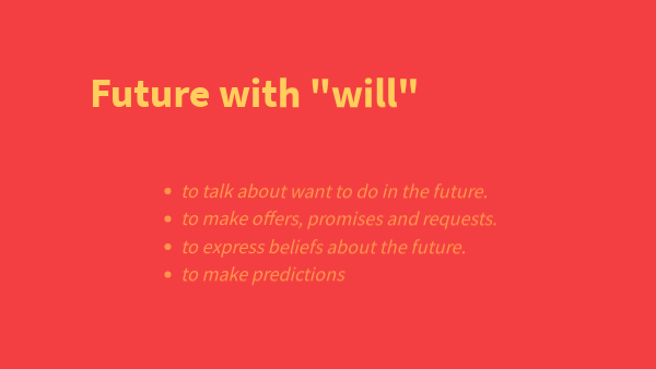 Examples: I will be a teacher They will win the lottery We will be happy She will find a friend at school