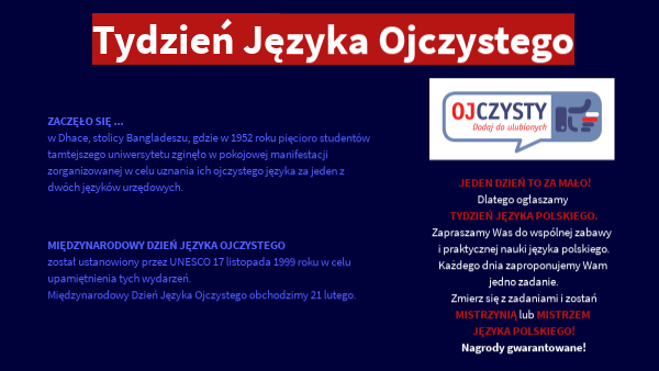 JEDEN DZIEŃ TO ZA MAŁO!Dlatego ogłaszamy TYDZIEŃ JĘZYKA POLSKIEGO. Zapraszamy Was do wspólnej zabawy i praktycznej nauki języka polskiego. Każdego dnia zaproponujemy Wam jedno zadanie. Zmierz się z zadaniami i zostań MISTRZYNIĄ lub MISTRZEM JĘZYKA POLSKIEGO! Nagrody gwarantowane!