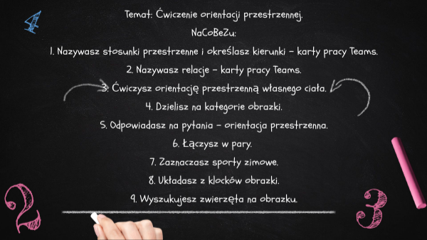 Temat: Ćwiczenie orientacji przestrzennej. NaCoBeZu: 1. Nazywasz stosunki przestrzenne i określasz kierunki - karty pracy Teams. 2. Nazywasz relacje - karty pracy Teams. 3. Ćwiczysz orientację przestrzenną własnego ciała. 4. Dzielisz na kategorie obrazki. 5. Odpowiadasz na pytania - orientacja przestrzenna. 6. Łączysz w pary. 7. Zaznaczasz sporty zimowe. 8. Układasz z klocków obrazki. 9. Wyszukujesz zwierzęta na obrazku.