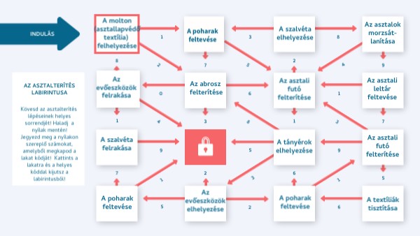 Kövesd az asztalterítés lépéseinek helyes sorrendjét! Haladj a nyílak mentén!Jegyezd meg a nyílakon szereplő számokat, amelyből megkapod a lakat kódját! Kattints a lakatra és a helyes kóddal kijutsz a labirintusból!