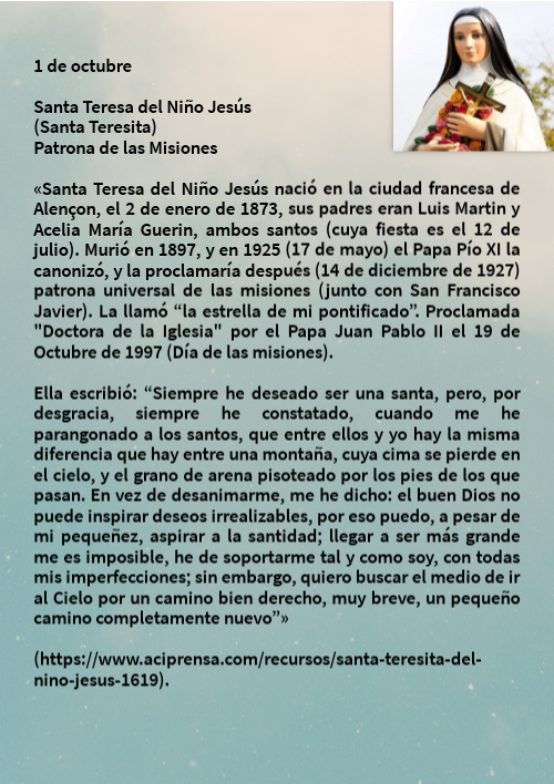 1 de octubre Santa Teresa del Niño Jesús (Santa Teresita) Patrona de las Misiones «Santa Teresa del Niño Jesús nació en la ciudad francesa de Alençon, el 2 de enero de 1873, sus padres eran Luis Martin y Acelia María Guerin, ambos santos (cuya fiesta es el 12 de julio). Murió en 1897, y en 1925 (17 de mayo) el Papa Pío XI la canonizó, y la proclamaría después (14 de diciembre de 1927) patrona universal de las misiones (junto con San Francisco Javier). La llamó “la estrella de mi pontificado”. Proclamada "Doctora de la Iglesia" por el Papa Juan Pablo II el 19 de Octubre de 1997 (Día de las misiones). Ella escribió: “Siempre he deseado ser una santa, pero, por desgracia, siempre he constatado, cuando me he parangonado a los santos, que entre ellos y yo hay la misma diferencia que hay entre una montaña, cuya cima se pierde en el cielo, y el grano de arena pisoteado por los pies de los que pasan. En vez de desanimarme, me he dicho: el buen Dios no puede inspirar deseos irrealizables, por eso puedo, a pesar de mi pequeñez, aspirar a la santidad; llegar a ser más grande me es imposible, he de soportarme tal y como soy, con todas mis imperfecciones; sin embargo, quiero buscar el medio de ir al Cielo por un camino bien derecho, muy breve, un pequeño camino completamente nuevo”» (https://www.aciprensa.com/recursos/santa-teresita-del-nino-jesus-1619).