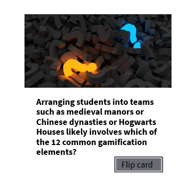 Arranging students into teams such as medieval manors or Chinese dynasties or Hogwarts Houses likely involves which of the 12 common gamification elements?