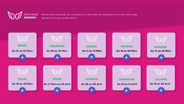 Recherchez la période qui correspond à votre date de naissance et trouvez votre ange gardien ainsi que sa déscription.