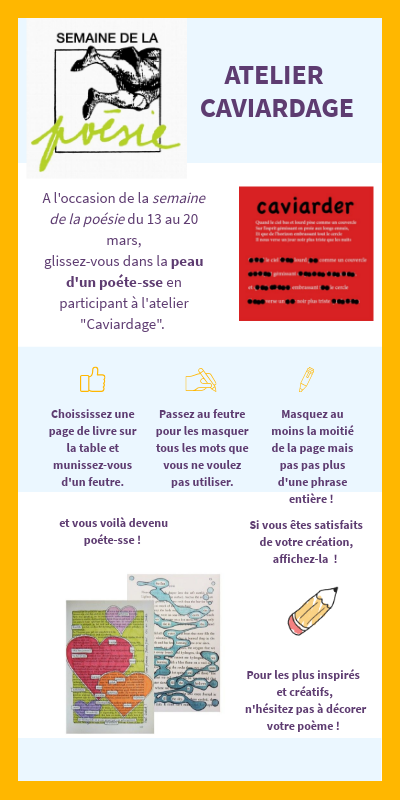 A l'occasion de la semaine de la poésie du 13 au 20 mars, glissez-vous dans la peau d'un poéte-sse en participant à l'atelier "Caviardage".