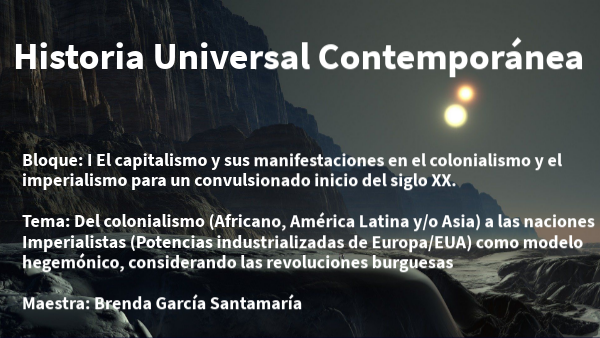 Bloque: I El capitalismo y sus manifestaciones en el colonialismo y el imperialismo para un convulsionado inicio del siglo XX. Tema: Del colonialismo (Africano, América Latina y/o Asia) a las naciones Imperialistas (Potencias industrializadas de Europa/EUA) como modelo hegemónico, considerando las revoluciones burguesas Maestra: Brenda García Santamaría