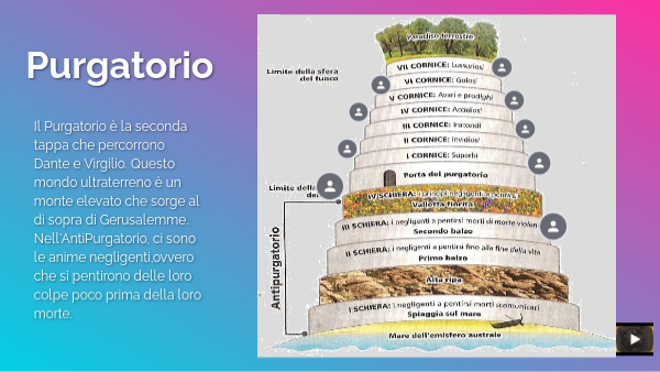 Il Purgatorio è la seconda tappa che percorrono Dante e Virgilio. Questo mondo ultraterreno è un monte elevato che sorge al di sopra di Gerusalemme. Nell'AntiPurgatorio, ci sono le anime negligenti,ovvero che si pentirono delle loro colpe poco prima della loro morte.
