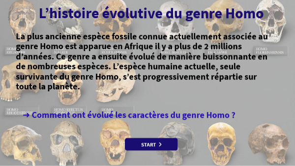 La plus ancienne espèce fossile connue actuellement associée au genre Homo est apparue en Afrique il y a plus de 2 millions d’années. Ce genre a ensuite évolué de manière buissonnante en de nombreuses espèces. L’espèce humaine actuelle, seule survivante du genre Homo, s’est progressivement répartie sur toute la planète.