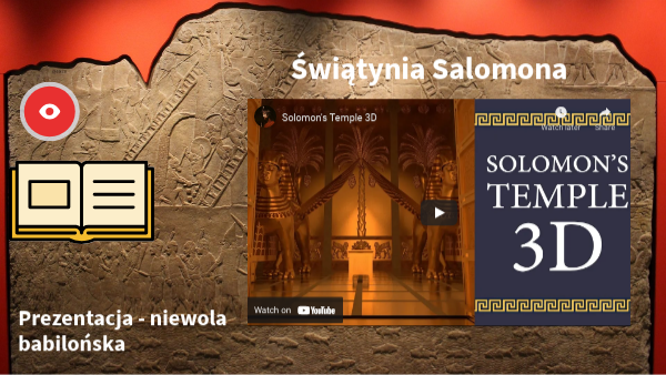 Temat: Wygnanie babilońskie. Po śmierci króla Salomona (w 931 r.), naród izraelski popadł w wielkie zepsucie moralne, zaczął czcić bożków pogańskich. Królestwo Izraela zostało podzielona na: 1. Izrael - na pólnocy (stolica w Samarii) - podbite przez Asyrię w 721r. 2. królestwo Judy - na południu (stolica w Jerozolimie) - przetrwało 130 lat dłużej. Król babiloński Nabuchonodozor II zdobył Jerozolimę, spalił świątynię, a ludność uprowadził do niewoli w Babilonii. Wygnanie trwało 70 lat, ale dla Izraelitów było czasem nawrócenia, powrotu do przestrzegania przykazań i umocnienia w wierze. Wolność przywrócił im perski król Cyrus II Wielki, który podbił Babilon. Niewola ta jest symbolem grzechu, którego każdy chrześcijanin powinien unikać.