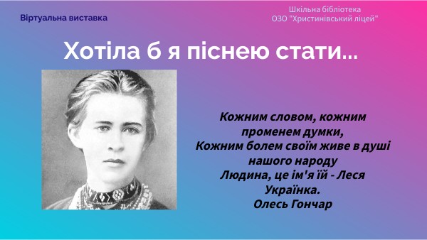 Кожним словом, кожним променем думки, Кожним болем своїм живе в душі нашого народу Людина, це ім'я їй - Леся Українка. Олесь Гончар