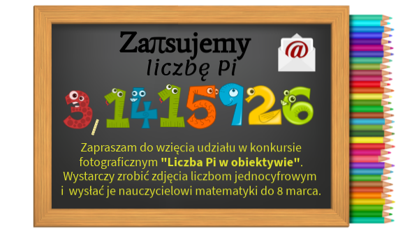 Zapraszam do wzięcia udziału w konkursie fotograficznym "Liczba Pi w obiektywie". Wystarczy zrobić zdjęcia liczbom jednocyfrowym i wysłać je nauczycielowi matematyki do 8 marca.