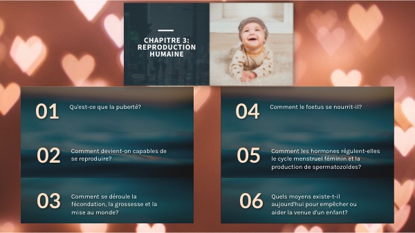Bilan 3:La fécondation d'un ovule par un spermatozoïde crée une cellule-oeuf. Après plusieurs divisions, elle forme un foetus puis un embryon. Petit à petit, les organes apparaissent et deviennent fonctionnels. Après 9 mois, le bébé nait et peut continuer à se développer.