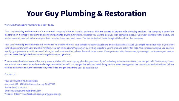 Work with this Leading Plumbing Company Today Your Guy Plumbing and Restoration is a top-rated company in the BC area for customers that are in need of dependable plumbing services. The company is one of the leaders when it comes to repairing and restoring damaged plumbing systems. Whether you want to do away with damaged pipes, or you want to improve the quality and performance of your hot water tank, your toilet or other fixtures in your home. You can do both of those things with help from this company. Your Guy Plumbing and Restoration is known for its trustworthiness. The company answers questions and explains most issues you might need help with. If you aren't sure what is wrong with your plumbing system, you can find out what's going on by inviting experts to your home and asking for help. The company will give you answers rapidly, give you accurate estimates and allow you to choose whether to have the work done or not. When you meet with the company you can get the answers you want so you can make the right decision concerning the work you get done. This company has been around for many years and also offers emergency plumbing services. If you're dealing with a serious issue, you can get help fro it quickly. Learn more about water removal and water damage restoration as well. You can get the help you need fixing serious water damage and the costs associated with them. Call the team to learn more about the services they offer today and get answers to your questions now. Contact Us Your Guy Plumbing & Restoration Address:2909 - 13696 100th ave , Surrey, BC V3T 0l5 Phone: (604) 200-0162 Email:yourguyplumbing@gmail.com Website: https://www.facebook.com/yourguyplumbing/
