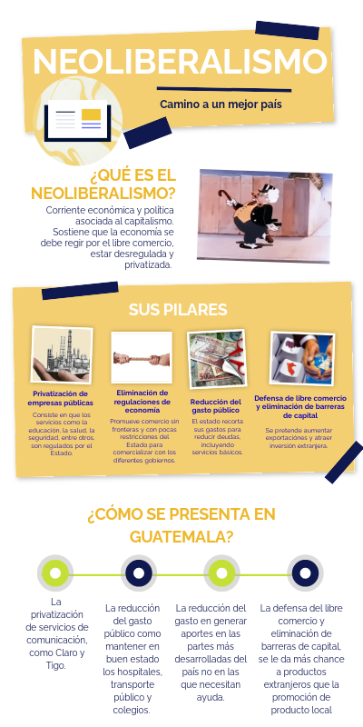 Corriente económica y política asociada al capitalismo. Sostiene que la economía se debe regir por el libre comercio, estar desregulada y privatizada.