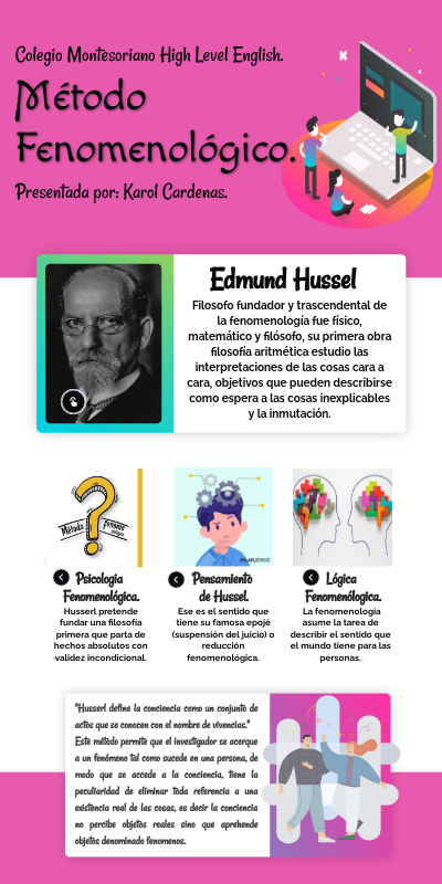 "Husserl define la conciencia como un conjunto de actos que se conocen con el nombre de vivencias."Este método permite que el investigador se acerque a un fenómeno tal como sucede en una persona, de modo que se accede a la conciencia, tiene la peculiaridad de eliminar toda referencia a una existencia real de las cosas, es decir la conciencia no percibe objetos reales sino que aprehende objetos denominado fenomenos.