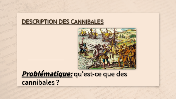 Montaigne dans son livre utilise les mots "barbares" et "sauvages" pour désigner les Cannibales barbare=homme débrouillard et qui parle une langue étrangère sauvage=un homme de la forêt, cela renvoi à quelque chose de violent, cruel Montaigne va s'engager dans son livre à redéfinir le mot "sauvage". Il va affirmer que le sauvage est un brut.
