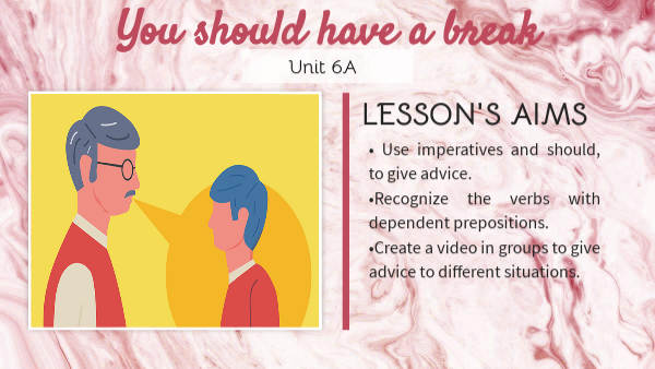 • Use imperatives and should, to give advice. •Recognize the verbs with dependent prepositions. •Create a video in groups to give advice to different situations.