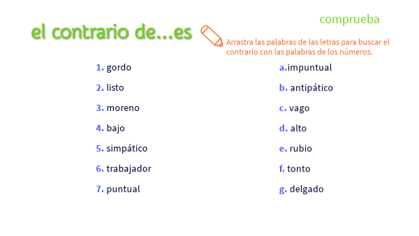 Arrastra las palabras de las letras para buscar el contrario con las palabras de los números.